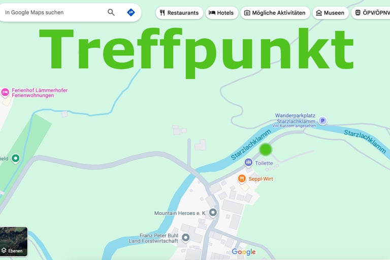 Der Treffpunkt für dein unvergessliches Canyoning-Abenteuer in der Starzlachklamm ist am Parkplatz Starzlachklamm, Winkel 18, 87527 Sonthofen. Der gut ausgeschilderte Parkplatz liegt direkt am Eingang zur Klamm und ist einfach mit dem Auto oder öffentlichen Verkehrsmitteln erreichbar. Von hier aus startet dein professionell geführtes Canyoning-Erlebnis durch eine der spektakulärsten Schluchten im Allgäu. Bitte sei pünktlich vor Ort, um genügend Zeit für die Vorbereitung zu haben. Der Treffpunkt ist ideal gelegen und bietet direkten Zugang zur Natur und zur Action! Starte dein Abenteuer in der Starzlachklamm – sicher, zentral und naturverbunden!